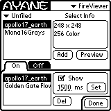 電源 ON/OFF 時に ImageViewer の画像イメージを出力する、Freeware のアプリケーションです。 <機能> ・16,4階調グレースケール対応 ・Image データの選択 ・ランダム表示機能 ・表示非表示、表示時間の設定 ・AutoOff 後の 5 秒以内の起動時の画像非表示 ※Palm OS 3.3 にアップグレードされていると正常に動かない事が報告されています。 |
