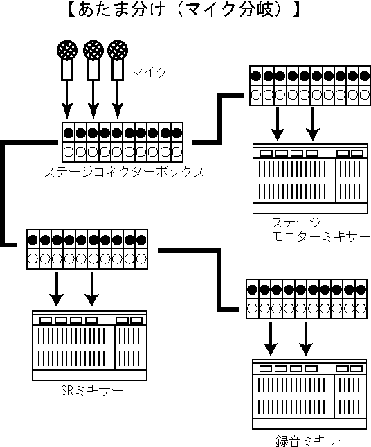 | あたまわけ(あたま分け) | . | コンサート等でSR(PA)(→SR・→PA)・放送・録音などで、それぞれ収音を行う場合、ミキシングされた信号を分岐するのではなく、マイクロフォンの出力を直接それぞれの部署に分岐すること。【同義】マイク分岐 |
