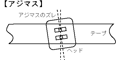 | アジマス | azimuth | テープレコーダーの磁気ヘッドのギャップとテープとの、垂直角度をいう。オーディオ用テープレコーダーは、テープ走行方向に対して磁気ヘッドのギャップが直角になるよう調整する。アジマス調整が正しくないと周波数特性の悪化、特に高音域の劣化の原因になる。ステレオの場合には位相特性の悪化につながる。 |