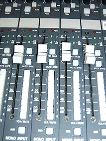| ブイシーエー(VCA) | voltage controlled amplifier | 電圧制御増幅器のこと。直流電圧の大きさに応じて増幅度を変化させるアンプで、音量調整器として用いる。これを使用すると音の信号が直にフェーダーを通過しないので、フェーダーの接点不良による雑音がない。VCAを用いれば、ひとつのフェーダーで多くの音響信号を同時に制御できるので、遠隔制御が容易にできる。また制御電圧を記憶させれば、自動的に何度でも同じレベルを再現できる。 | . |