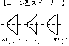 | コーン型スピーカー | cone type loudspeaker | 振動板が円錐形(cone type)をしたスピーカーのこと。コーンはボイスコイルに直結していて、ボイスコイルの動きにしたがって振動し、音波として放射される。コーンの材料はプラスティック、金属、布、カーボンなどであるが、紙(パルプ)を用いることが多い。コーンの形状には、ストレートコーン、カーブコーンパラボリックコーンなどがあり、周波数特性(→周波数特性)と指向性(→指向性)にそれぞれ特長がある。 |