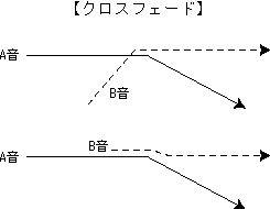 | クロス・フェード | cross fade | ふたつの音の音量を交差させて入れ替えること。CFと略記する。基本的には図のように、B音をゆっくり上げながらA音を徐々に絞る方法と、B音を初めから所定の音量で出して、A音を絞る方法がある。映像の場合はディゾルブともいう。照明ではCueからCueへ移行するともいう。 |