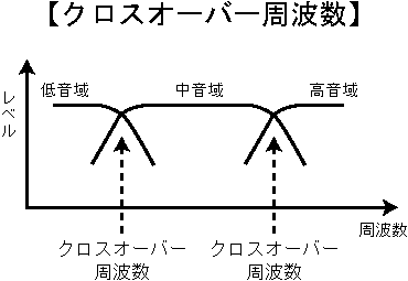 | クロスオーバーしゅうはすう(周波数) | cross-over frequency | マルチアンプシステム(→マルチアンプシステム)やマルチウェイ・スピーカーシステム(→マルチウェイ・スピーカーシステム)では、再生周波数をいくつかの帯域に分割し、帯域ごとに専用のアンプとスピーカーを使用する。例えば3ウェイであれば低音域、中音域、高音域に分割する。各音域の境界周波数をクロスオーバー周波数という。 |