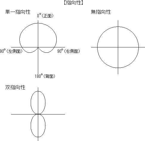 音の到来方向によるマイクロフォンの感度の違いを指向性という。どの方向からの音も一様な感度の無指向性(→無指向性マイクロフォン)、一方向からの音に対して感度が高い単一指向性(→単一指向性マイクロフォン)、前後の二方向からの音に対して感度が高い双指向性(→双指向性)がある。この様子をいくつかの周波数について図に示したものを指向特性という。単一指向性には、いくつかの種類がある。 |