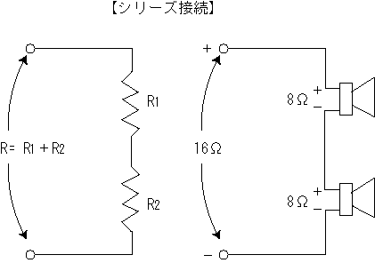 直列接続のことで、ひとつの線になるようにつなぐこと。極性のあるものは、陽極(+)と陰極(-)を交互につなぐこと。直列抵抗や直列インピーダンスは、それぞれの抵抗値を加えたものとなる。 |
