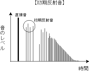 音源からの直接音が到達して直後に到来する反射音のこと。ほとんどの場合、天井または側壁から到来する。この初期反射音は、残響の印象や音質に大きな影響を及ぼすため、遅れ時間、到来方向、レベルなどについて建築音響の分野で多くの研究が行われている。 |
