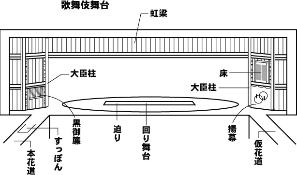 | ほんぶたい(本舞台) | 本来は歌舞伎舞台の上手大臣柱(→だいじんばしら)と下手大臣柱との間のこと。現在では花道に対して正面の舞台を本舞台と呼んでいる。プロセニアム劇場では、プロセニアムの内側を指す。 |