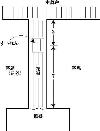 | しちさん(七三) | 劇場用語。(花道七三)ともいう。歌舞伎劇場の本花道(→はなみち)で、揚幕(→あげまく)から七三舞台の付際からは三分の場所。ここに「すっぽん」(→すっぽん)をつける。昔はこの割合は逆で揚幕よりだったが、階上席から見通せる場所として化政期(1804〜30)以後この場所となった。花道で登退場の俳優が観客の視線を浴びて、思入れ、気を変える、見得などの演技を行う場所。 |
