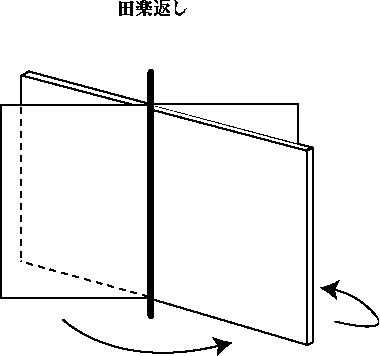 | でんがくがえし(田楽返し) | 舞台転換またはけれん(→けれん)の一方法。張り物(→はりもの)のある場所を方形に切って中央に軸を付け、その部分をくるりと回転して裏面の道具に代える方法。形が食べ物の田楽に似ているのでこの名がある。これはまた妖怪や忍術使いなどが壁の中に消えうせる仕掛けにも応用される。 |