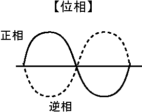 交流波形の位置を表す言葉。一周期を360度として表したとき、基準点からの位置を位相角という。同一周波数の波を合成する場合は、位相関係により合成波形は全然違った波形になる。位相が180度違った(逆相)同一波形を合成すると合成波はゼロ(信号が無くなる)となる。スピーカーを2台並べ、同じ信号を入れて鳴らす場合、同相の信号であれば互いに増強しあうが、どちらかに逆相の信号を入れると再生された音は互いに打ち消される。したがって、スピーカーを接続する場合、極性(+-)に注意する。同様に、2本以上のマイクをミキシングするときも位相関係に注意。 |