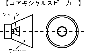 | コアキシャルスピーカー | coaxial loudspeaker | コアキシャルとは同軸という意味で、ウーファーの前面の同軸上にツイーターが配置されているスピーカーのこと。音源の位置が同じになるので、再生音の定位感がよい。 |