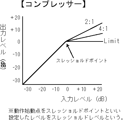 | コンプレッサー | compressor | 一般的に信号のレベルがある値を超えたときに、その信号レベルの上昇を抑える動作をするものをリミッターといい、比較的に低い値のレベルから徐々に圧縮する特性を持ったものをコンプレッサーという。したがって、リミッターのほうが動作上の圧縮比が高く、コンプレッサーのほうが圧縮比が低い。厳密に決められてはいないが、圧縮比が4:1程度までをコンプレッサーと呼ぶことが多い。【参照】→リミッター |