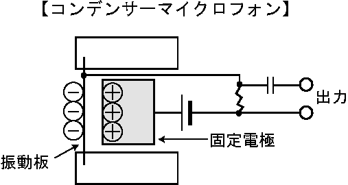 | コンデンサーマイクロフォン | condenser microphone | 静電容量の変化を利用して、音圧を電気信号に変換するマイクロフォン。固定電極と導電性の振動板との間に、外部からの直流電源によって静電気をたくわえてコンデンサーを形成させる。音圧によって振動板が振動すると固定電極との距離が変化して、静電容量が変化する。この変化を電気信号に変換する。原音に対する追従性がよく、ダイナミックレンジ(→ダイナミックレンジ)も広い。 |