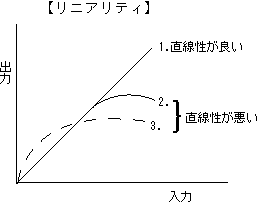 | リニアリティ | linearity | 直線性のこと。入力に対して出力が比例関係にあれば、直線性あるいはリニアリティがよいという。通常、音響機器はリニアリティのよい動作条件で使うのが原則である。【参照】→直線性 |
