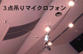 | さんてんつりまいくろふぉんそうち(3点吊りマイクロフォン装置) | . | 3本のワイヤーでマイクロフォンを吊り下げる装置。通常、ホールの客席前部の天井に設置されていて、手動または電動で3本のワイヤーの長さを調節してマイクロフォンを昇降する。クラシック音楽の録音のメインマイクロフォンやノイズ収音用のマイクロフォン、エアモニター用のマイクロフォンなどに使われる。【参照】→ノイズマイク |