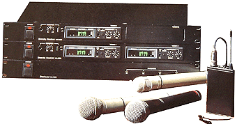 無線方式のマイクロフォン。マイクコードの代わりに電波を使ったもので、マイクロフォンの中に送信機を組み込んだものと、通常のマイクロフォンを小型送信機に接続して使用するものとがある。送信機から発射した電波は受信機で受信されて、音声信号に変換される。マイクコードがないために、設置の困難な場所での収音や、動きのある音源の収音に便利。ラジオマイク(→ラジオマイク)ともいう。 |