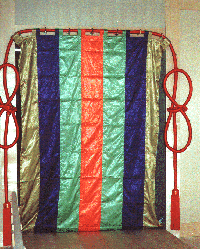 | あげまく(揚幕) | 能舞台における鏡(→かがみ)の間と橋掛り(→はなみち)の境に下げてある五色仕立ての幕。切幕ともいう。 |