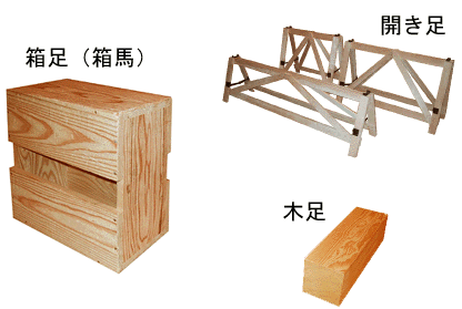 | あし(足) | スタジオや舞台において、床よりも高く舞台装置を組むとき、平台(ひらだい)の下に入れて支える台のこと。「うま」「はかま」などともいう。箱足(はこあし)は足の代表的なもので、箱の置き方で高さが変わる便利な道具。「箱馬」ともいう。他に「開き足」「木足(木台)」など。 |