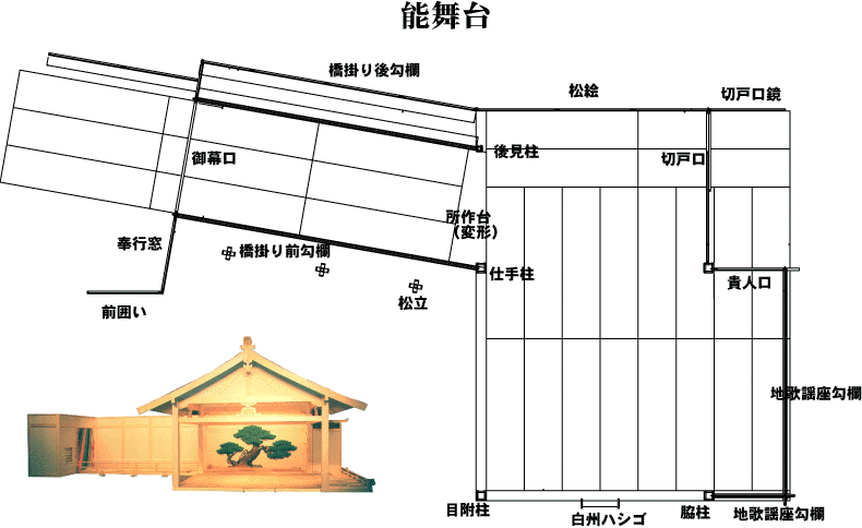 能と狂言を演じる専門の舞台。3間(約6m)四方の舞台で、前後への動作を強調することによって演技の幅を拡げ、立体感のある表現を可能にしている。観客も正面と脇正面、地裏のそれぞれの角度から観賞する。ただし現在では地裏はほとんど客席にしていない。地謡座(じうたいざ)は、能のときに地謡が座る位置。舞台の後方には後座(あとざ)があり、囃子や後見などが座る。また、演者(シテやワキ)がこの場所に行って座ると、舞台から姿を消したという約束になっているので、扮装を変えるときや場面転換のときに後座を使用する。後座から斜めに鏡の間につながる橋掛かりは、演技者の登場や退場に用いられるが、場面を転換させるときや舞台と別な場所を想定するときに用いられる。鏡の間は大きな鏡のある板敷きの部屋で、面を用いる役はこの場所で面を着ける。能楽堂の舞台が、屋内にもかかわらず屋根が付いているのは、江戸時代まで屋外に建てられていたからである。 |