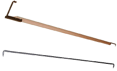 | しぎ(支木、心木) | 大道具用語。大道具の張り物(→はりもの)や切出し(→きりだし)などを立てるために使用する一種のつっかえ棒。棒の両端に鎹を取り付けたもので、舞台床と張り物などの裏側の木枠に引き込んで留める。全体が鉄製のものを金支木という。 | 写真 |
