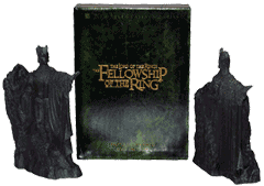 それぞれの指輪に託されたそれぞれの部族と国の平和、しかしたった一つの邪悪な指輪の力はそれらを上回るものだった。そんな指輪に翻弄される数奇な運命の幕がここに切って落とされる。がんばれホビット、中原の行く末は君の肩に掛かっているぞ。 というわけで満を持して登場のソード&マジックの世界第1部、静かなホビットの村から始まるかと思いきや、壮大なスケールで描かれる指輪誕生の冒頭からいきなり異世界に放り込まれてしまいます。これがけっこう駆け足なんだけど手に汗握って目が離せません。サウロンの指輪がビルボに渡って舞台はようやく牧歌的なホビットの村に移り、フロドにガンダルフも登場します。このロケーションがまたのどかで、ビルボの誕生祭もいかにも田舎のカーニバルでいい雰囲気なんですね。それにビルボの冒険話に夢中になる子供たち、なんと目の輝いていることか。ここでこの世界に引きずり込まれたらもうしめたもの、あなたも私も冒険の旅の一員です。このあとからは急転直下、奇怪な騎士団の追っ手を逃れつつ冒険の旅が始まりますが、劇場でのお楽しみ。壮大で美しく素晴らしいニュージーランドのロケーション、息をもつかせぬ3時間、ドキドキハラハラワクワクしっぱなしですぞ。 長大な物語の映画化は基本が大切ということで脚本重視、さすがにあわただしい感は否めないけど語るべきところはしっかりと語られます。各キャラクターの背景が弱いかなとは思いますが、なぁに主人公フロドだって外の世界は知らないんだからいいじゃないですか。そんな旅の仲間たちも含めて、誰一人として聖人君子ではなく、指輪の魔力にうち勝つ者もいれば屈してしまう者もいます。この疑惑と葛藤の描写がまた生々しいんですが、だからこそありがちな冒険活劇にとどまらないんですね。ただし、エルフの森でのそんなシーンにはかなり腰砕け。心理描写は生身の役者の本領なのに、CGでやっちゃいけないよ。 そんなこんなで良くも悪くもテンションはあがりっぱなしなんだけど、中盤ではたと気づく既視感にも似た妙な違和感。いや、クライマックスの連続なのはさておき、俯瞰のカメラアングルがやけに多いんですね。浮遊感もさることながら、せっかく入り込んだ物語を一歩下がって見る感じになってしまいます。さらに、そうでなくても同じアングルになりやすい空撮が多用されすぎているのが残念、まるで特番ドキュメンタリーを観ているようだった。ついでにいえば、アクションシーンが今時のアップ多用でなんだかわからなかったのも残念。これさえなければ手放して喜べたんですが。 DVDを入手して気がついた、これは劇場の巨大なスクリーンで観てこその作品。意地悪な言い方をすればニュージーランド環境ビデオの迫力に助けられている部分もあるんだけど、どんなに音量を増してもどんなに画面に近づいても(良い子は真似しないように)、劇場ほどの臨場感は得られなかった。いや、大サイズのホームシアターなら多分違うんだろうけど。 Special Extended DVD Editionは単なる再編集版ではなく、3時間の長編である劇場版ですらあわただしかった分を補い、丁寧で落ちついた仕上がりになっています。さすがに3時間30分を一気に鑑賞するのはハードですが、それでもあっという間に感じてしまうのは賞賛に値するでしょう。ニュージーランドの環境映像と感じさせるところもなくなり、続編への期待高まるラストも、一応の満足感が得られます。ただし、今回はディスク2枚になった本編ですが、そのつながりがやや唐突なのは残念。前編と後編らしい処理をしてほしかったところです。アルゴナスの石像のブックエンドは、そのセット価格に比して素晴らしい仕上がりとなっています。もうちょっと厚みがあれば、さらに高級感が増したとは思いますが、劇中のセットもあまり厚みがないので致し方ないところ。ところで、向かって左側の像が右の手に持っている物は何?(斧のようですね) |