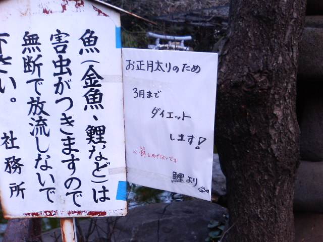 ともあれ、記念に看板を撮ってみることに。 ![]() あと、鯉の池があったのでいってみると・・・ ![]() ダイエット中でした。鯉もハイカラなようです。 |