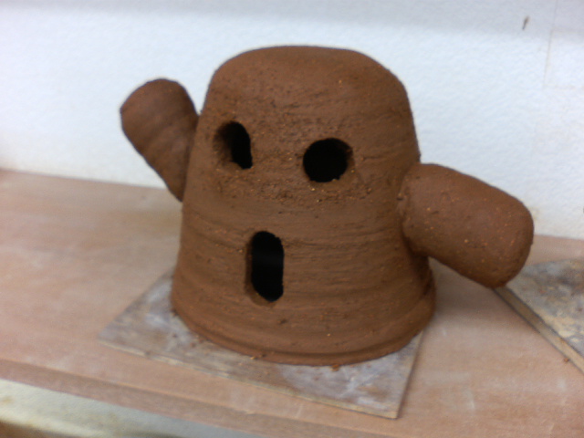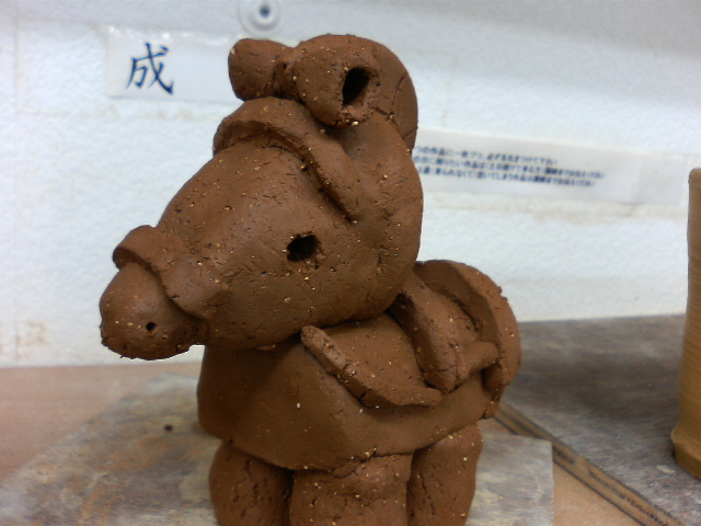 | 2004年7月11日 野焼き大会(準備編) 8月21日に行われる市川市民祭りの縄文野焼きに、陶芸教室で参加することになりました。市民祭りだけあって、一般の人の持ち込みはもとより、市内の小学校の子供たちが全校あげて作品をつくってたりと、割と大きなお祭りになりそうです。 というわけで、野焼き用の作陶テーマは、 小学生にギャフン(死語)と言わせてやるもの に決定。格の違いを見せ付けてやるぜ、と考えている時点で自分が格下ということに本人が気づいていませんが、気にしてはいけません。 で、作戦を練ってみました。 ライバル達(小学生)は、恐らく教科書の縄文焼きのイメージでつくるでしょう。そこから推測すると、縄文土器か、「はにわ」と思われますが、「はにわ」は形が難しいですから恐らく紐積みで土器を作ってくる。間違いありません。 向こうは学校単位で参加ですから、ライバルと同じ土器を作っていては数の力で敗北決定です。そこで、作ってくる可能性が低い「はにわ」をつくることでライバルに差をつける作戦に決定。 しかし中には「はにわ」を作ってくる猛者もいるかもしれません。そこは抜かりなく「はにわ」と必ずセットで登場する馬も用意します。N○Kで「はにゃ」とか「ふにゃ」とか言ってたあのコンビですね。 で、まずは馬を。 本当はコンビで作りたかったんですが、馬の相方側の難易度が高く、早々に挫折。ノーマルなものになりました。はにゃ。 このままではつまらないので、ランプが入るように穴をあけておきました。 これでランプを点灯させて、 「ハニーフラッシュ」 なんて叫ぶらしいです(何か違う) 来週は、作品を搬入するために、小学校に ライバルの作品が撮れたら次回報告予定! |