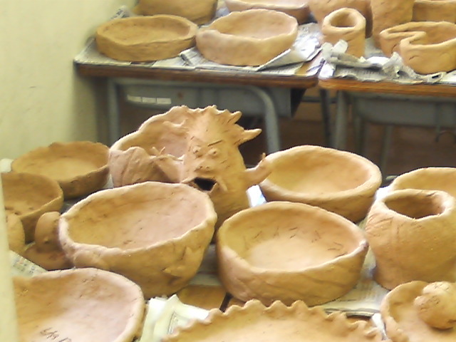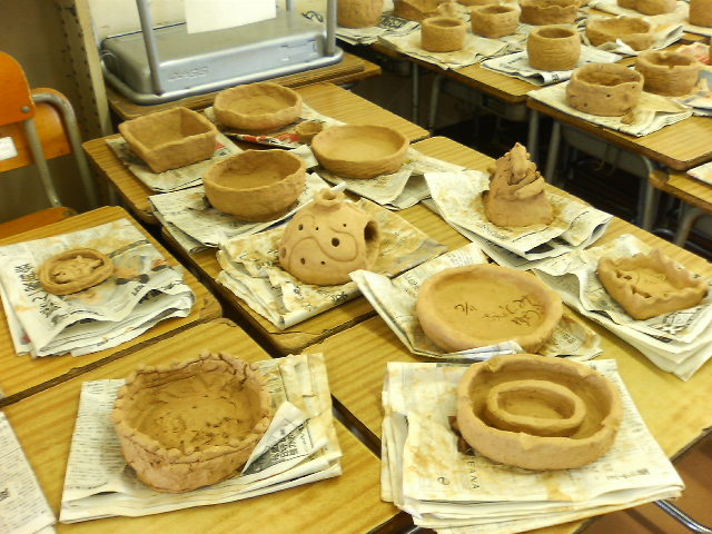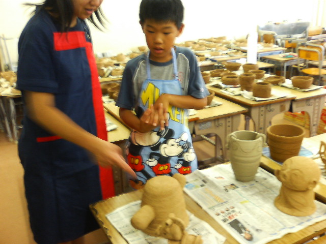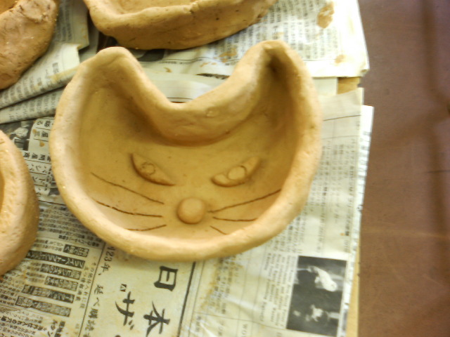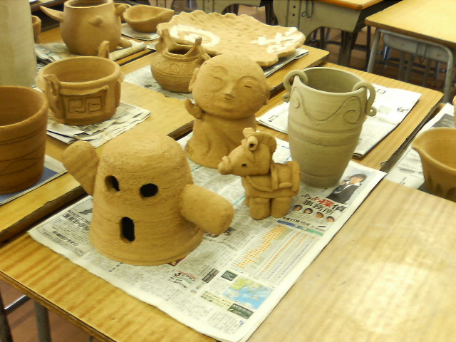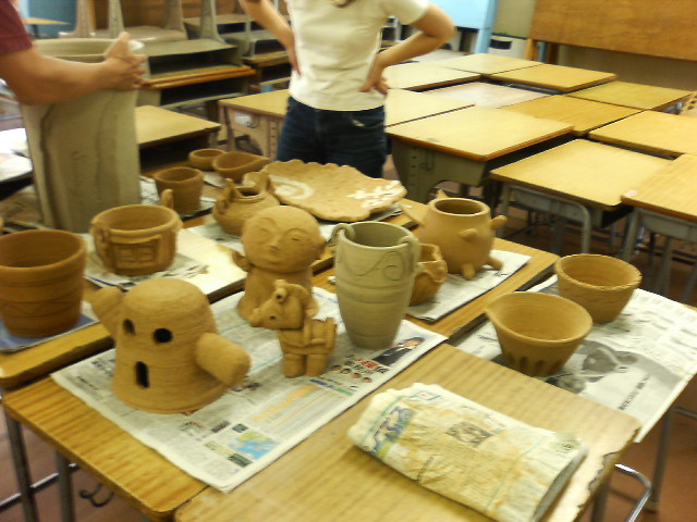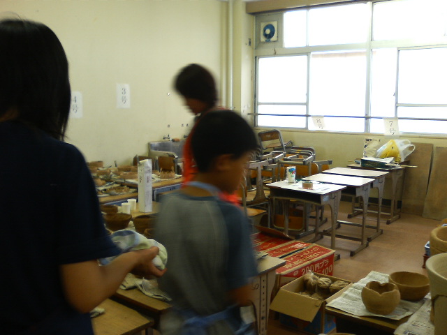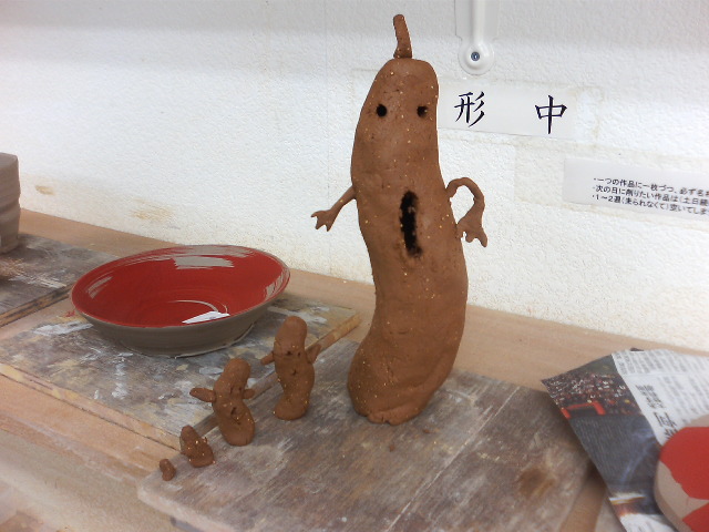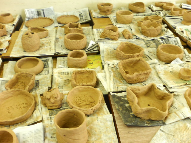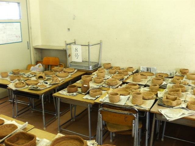 | 2004年7月18日 野焼き大会( 8月21日に行われる市川市民祭りの縄文野焼きで小学生にギャフンといわせる企画。今回は小学生が作陶をしている現場に潜入しました。 といいますか、一度一箇所に集めて野焼き会場に搬入するようです。 小学校の教室なんて、本当に久しぶりです。 私が小学生くらいだった、ということですから引き算すると、 10年ぶりくらい はい、ウソです。脳みそは小学生くらいですが。 で、搬入。作品がおかれていたのは2教室分でした。 小学生は隣の教室で打ち合わせをしていたので、その間に搬入&撮影。 こんな感じで当日まで乾燥させます。 このように顔とか星とか、 猫のように独創的なものも。こんなのはまさに小学生の作品っぽくてよいですね。 野焼き用の粘度は粒が粗いので、細かいものをつくるのは結構難しいです。 なので、今回はにわのようなものはないだろうなーと思っていたのですが、 芸がぬきんでて細かいです。これを で、わが陶芸教室のコーナーはこちら。 左上の大きいのは先生が作ったものでもとの土は25Kgもあります。 んで、隣の教室の打ち合わせが終わるのを見計らって、小学生ウケしそうなものを一箇所にあつめてみました。 打ち合わせが終わって小学生がぞろぞろとやってきました。 撮り逃したのですが、3,4名の集団がこちらのコーナーに殺到していました。 先生の大物をみて 「でけー」 はにわ見て 「どうやってつくったんだー」 と絶叫。 お母さんが何か解説中。 というわけで、作戦はまずは成功ということなんですが、 ハニワの目に指を突っ込むのはやめてください というわけで、来週最後の搬入をして来月野焼きです。楽しみです。 NEXT 搬入作品「はにわ親子」 |