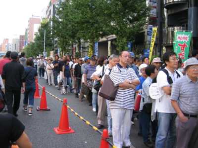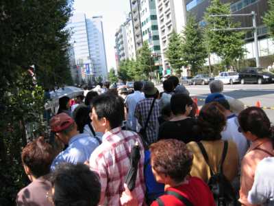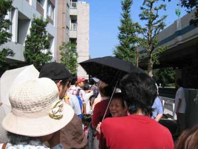 | 2004年9月12日 さんま祭りにいってきた しだいに秋に近づいてきた今日この頃、秋刀魚の美味しい季節になりました。 やはり何でも美味しいものは地元で有名なものに限ります。 たとえば、 カニだと、北海道。 ふぐだと、下関。 秋刀魚だと目黒。 はい、常識ですね。来週の試験に出るのでよく覚えておいてください。 て、目黒って 山手線上にあるところ なんですが、海はどこにあるんですか?などとそんな小さいことは気にしてはいけません。どうやらここで、秋刀魚のお祭りがあるのです。 というわけで、さんま祭りなんですが、どうやら焼き秋刀魚が無料で配られるとの事。 秋刀魚が5000匹用意されているそうです。これは秋刀魚好きには興味あるところです。というわけで突撃決定。 開始が10時からということと、1日で12000人の来場者ということで昼間にはかなり混むといったことを聞いていたので、9時50分に現場に到着。自宅から約1時間です。 まさか焼き秋刀魚1匹無料でもらえるからって、このくらい早く来れば大して人もいないでしょう。 ![]() たくさんいた。 えーとここは、 ![]() ビッグサンダーマウンテンの行列ですか? だいたい500mくらいは並んでます。 (午前9時50分現在) いくら 秋イコール秋刀魚だよー、とか、 祭りはやっぱりこうでなきゃ、とか 言っても、限度があります。やりすぎです。 というわけで、大人の私は、