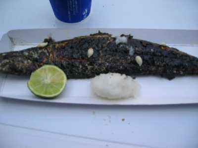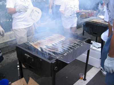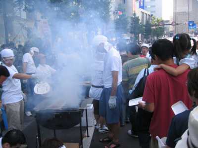 最後尾に並びました。 そりゃそうですよ。 人多すぎ〜などと言って帰ってしまう人達もいましたが、 祭りは人が多いのがいいんですよ!。 秋と言えば、秋刀魚なんですよ! ここで帰ったら早起きした意味が無いんですよ! というわけで、ひたすら待つ待つ。 ![]() あと交差点2つ分くらいまで来たところです。さんまは見えませんが 人はたくさん見えます。すごいことになっています。 ![]() 何はともあれ、到着。ここまで1時間半待ち。あぁ。 さすがにここまでたどり着くと、今までの疲れを忘れます。 よーし食べるよ〜 ![]() あたり一面秋刀魚だらけです。 ![]() これがゲットした秋刀魚。すだちも付いてきます。 写真上に何か見えますが、昼からビールを飲んでいたなんてそんな 馬鹿なあっはっは。 ところで、何故目黒で秋刀魚なのか?ということですが、 公式HP( http://www.asahi-net.or.jp/~xq7k-fsm/sanma.htm)によると、 「新聞の記事を見た岩手県宮古市から連絡がありました。「なぜ、そちらでは毎年宮古のさんまを使っているのですか?」とのこと。当時、商店街ではお客さんに一番鮮度の良いさんまを食べていただく為に、南下するさんまが9月中旬で最も脂がのっておいしい宮古産を築地で仕入れていたのです。このことに感動していただき、平成11年の第4回より宮古市からさんまを無料で提供していただくことになりました。」 なるほど、秋刀魚は岩手県の宮古市直送のもののようです。 で、何故目黒でさんま祭りなのか?ということなんですが、 落語で「目黒のさんま」というのがあるようです。 ここで読むことができますが、 あんまり面白くありません 会場で寄席をやっていたので、そこで聞くとまた面白かったのかもしれませんが・・・ ま、いいか。秋刀魚美味しかったし。ビバ秋刀魚。 |