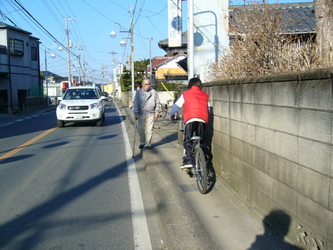 写真2は、子供の自転車とすれ違うために車道に降りようとしている高齢者。