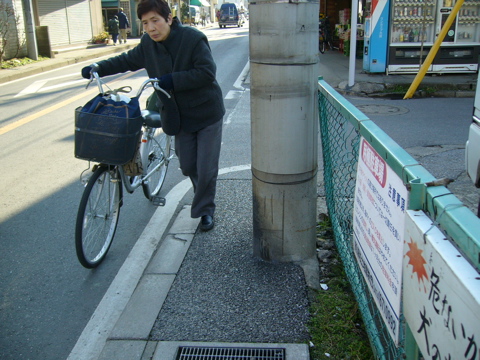 写真1は、電柱があるために車道に降りた自転車と主婦、