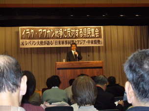 集会では、元レバノン大使の天木直人さんが「日米軍事同盟とアジア・中東状勢」と題して講演を行った。天木さんはイラク戦争とは何であったのか、日本の安全施策をどう考えるのか、憲法9条こそ最強の安全安保政策であると訴えた。