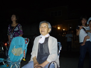 24日は、降り出した雨が止まず、痺れを切らした踊り子さん達が8時前「やりましょう」と雨の中盆踊りを強行、私も一緒になって踊りはじめた。