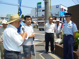 23日、踊りに見えた市長に、古和釜小学校校門近くで発生した床下浸水の被害を報告し、その対策の早期実施を要望した。