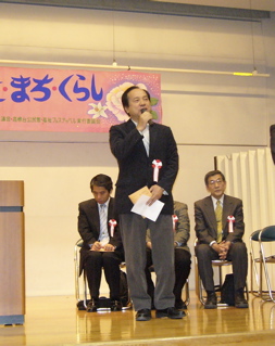 午前中、第7回高根台地区福祉フェスティバルに参加。来年4月から旧高根台1小に市立特別支援学校の小学部が引っ越して来る。今回のフェスティバルには支援学校の子どもたち参加し、デズニーダンスを披露した(写真1)。「障害のある子もない子も、子どもも大人もお年寄も地域で交流し助け合うまちづくりが大切だ」とスピーチした(写真2)
