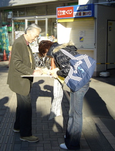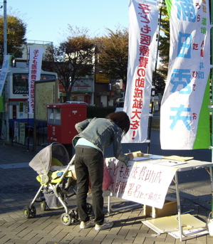午後からは高根公団駅前で、子ども医療費の助成拡大を求める署名運動。若い子育て中のお母さんから、お年寄りまで足を止めて署名をしてくれた。