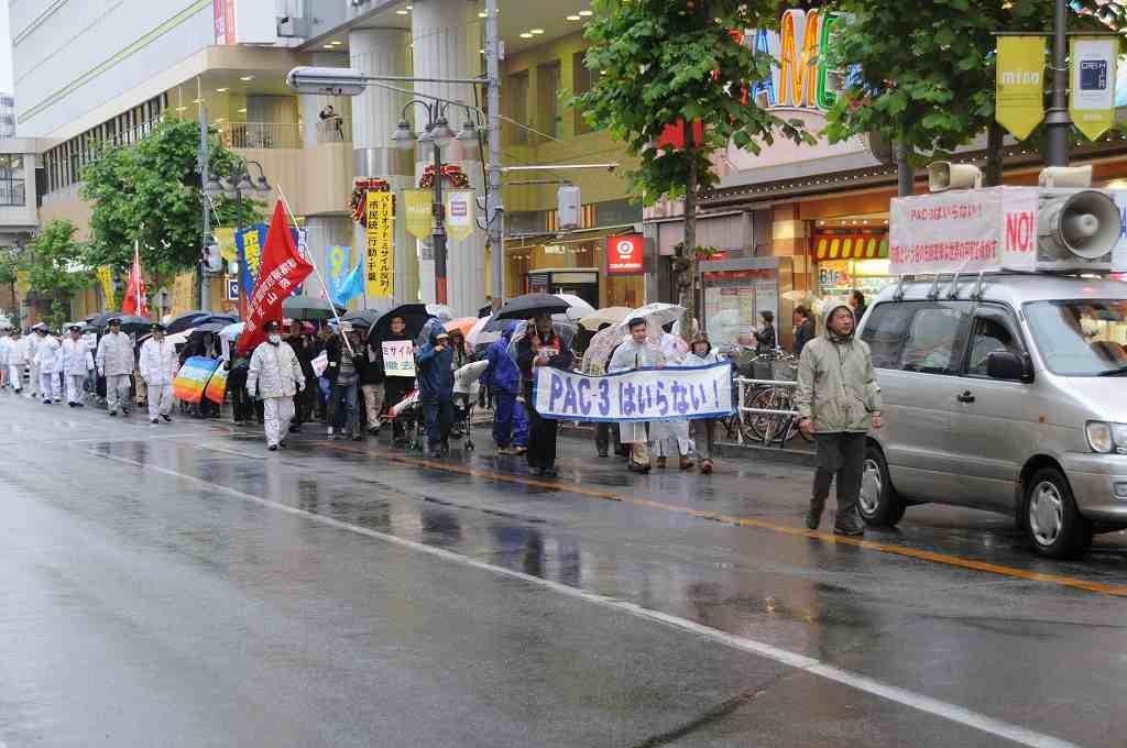 冷たい雨が降る中、パトリオットミサイル強行配備1年市民統一行動の集会とデモ行進が行なわれ130名の市民が参加した。