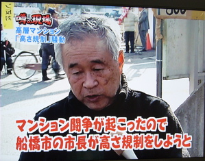 高さ制限」規制前の駆け込みマンション建設に反発する住民運動の状況が放映され、私もこの問題を議会で取り上げてきた議員として出演し、高さ制限が遅れている理由などについて述べた。15分程度取材を受けたが、実際の放映1は分足らずだった。