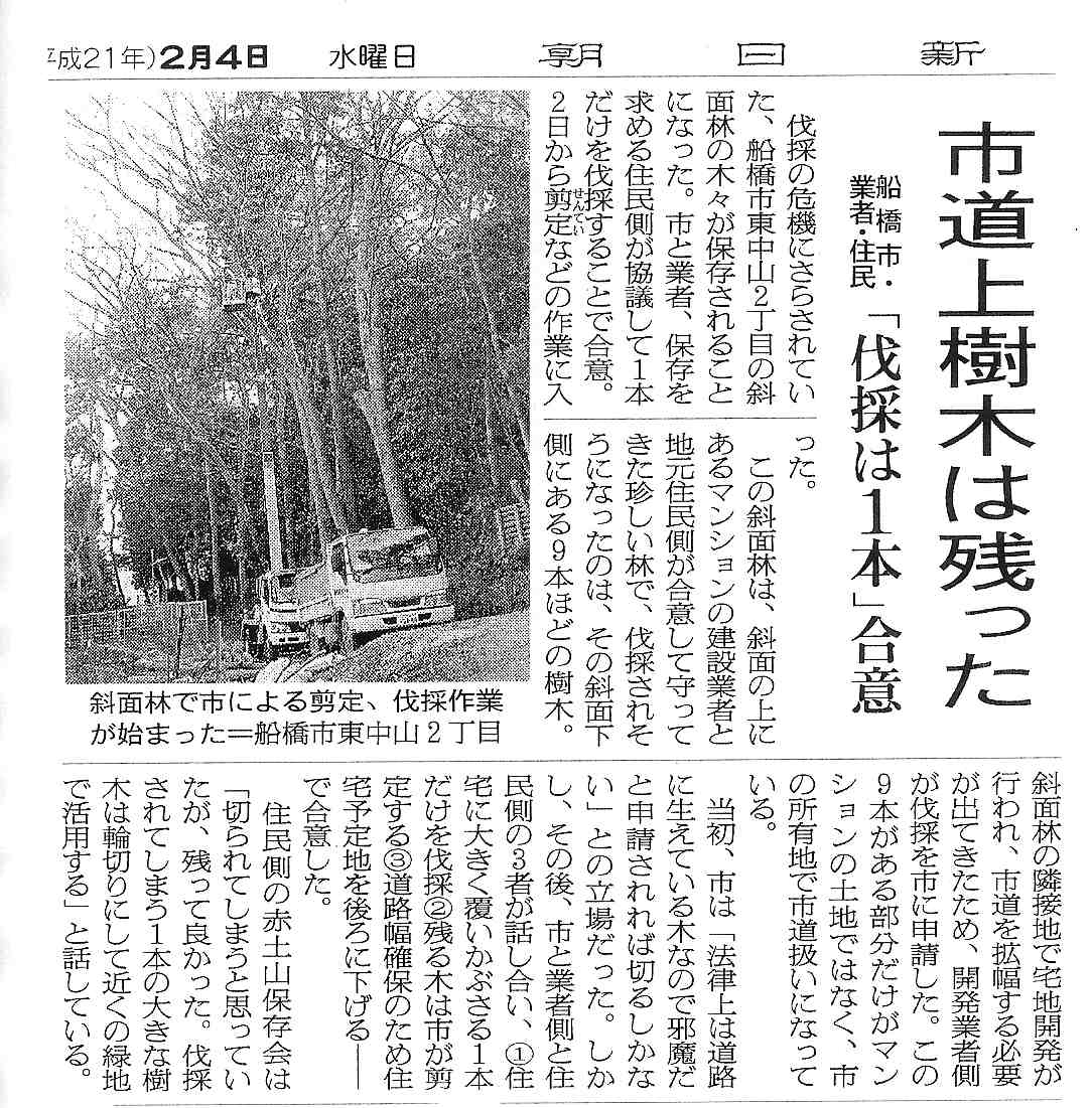 1月27日の当サイトに掲載した「東中山2丁目の斜面林が保存されること」が今朝の朝日新聞で