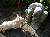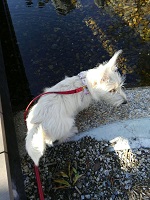 いつもの公園の中を流れる小さな水路に、入って行きたそうなヒヨリ。