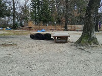 黒い塊がワンコ。ベンチをのぞいています。