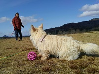 ヒヨリ。遠くにワンコの姿を見つけると、すかさず「伏せ」で待機。