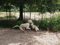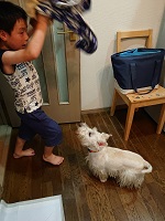 柴犬のハチ君にはガウガウとじゃれついていくのに、