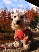 朝の冷え込みが厳しいので、散歩の時は服を着せてやってます。