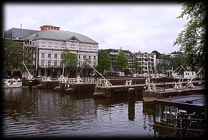 | アムステルダム名物の運河 水位差がある場合は閘門を使う | 路面電車の通る橋も船の通過時には開く |
