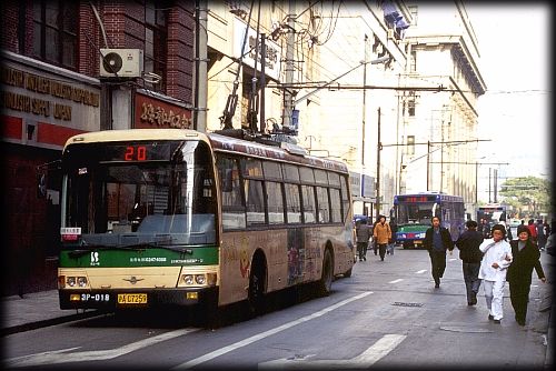 上海には路面電車はない。一般のバスに混じって、トロリーバスが走っている。一応似たようなものということで、載せることにした。実際乗ってみると、路面電車とはちょっと違う。電気自動車ってこんな感じなんだな、というのが実感できる。