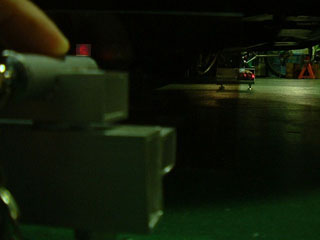 ブラウン色のアクリル越しだから見えづらいですね。 この映ったところがレーザー発射部と同じ線上にあれば、トーは±0になります。 鏡合わせの原理ですね。 暗い室内でも、ローダウンの車両でも、こんな感じで使えます。