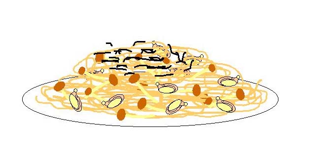 | 手 順 | @ 塩を加えて沸騰した湯でパスタを茹で始める。 ※ 茹で上がりまで残り3分になったら次の工程へ進む。 A シメジの根元部分を落として、1本1本にばらして、バターで炒める。 B シメジに火が通ったら、アサリ水煮缶の中身を全てフライパンに移し、熱してきたら火を止める。 ※ 汁気が少ないようなら、パスタの湯で汁を少々加える。 C パスタが茹で上がったら、素早くザルにあけ直ぐにフライパンに移して混ぜ合わせる。※ この時に好みで少々醤油を振ると風味が良い。 D 盛り付けて、刻み海苔をトッピングして出来上がり。 ※ アサリ水煮缶の汁とパスタの茹で汁で塩味は十分だが、足りなければ塩を足す。 |