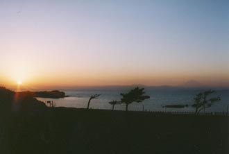 こちらは、横須賀市側から長者ヶ崎とともに撮影したものです。 この場所は、駐車場があるので、ドライブで一休みして夕日を見るのにも最適です。 |